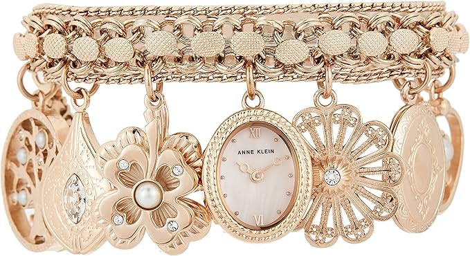 Slightly domed mineral crystal lens; rose gold-tone mother-of-pearl dial with matching hands and markers; rose gold-tone chain bracelet with jewelry clasp and extender