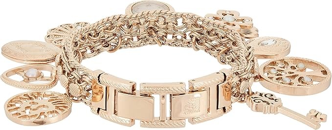 Bracelet includes eight dangling charms featuring a key, leaf, tree, clover, flower, locket and heart