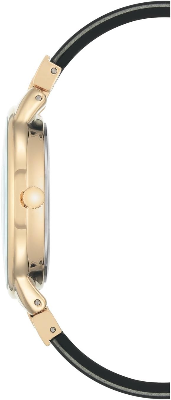 Slightly domed mineral crystal lens; glossy black dial with gold-tone hands and premium crystal accented markers; printed outer minute track