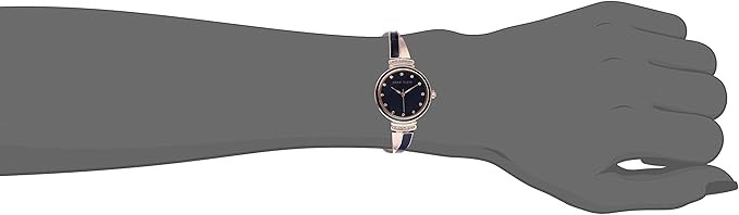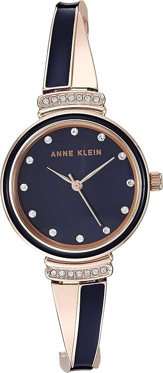 Lugs set with premium crystals; navy blue glossy dial with rose gold-tone hands and premium crystal markers; rose gold-tone and navy blue bangle with adjustable links; jewelry clasp and extender