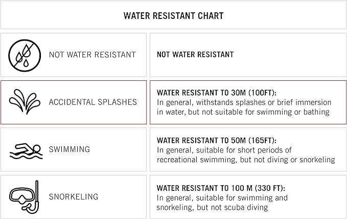 Water resistant to 30 meter (100feet): in general, withstands splashes or brief immersion in water, but not suitable for swimming or bathing