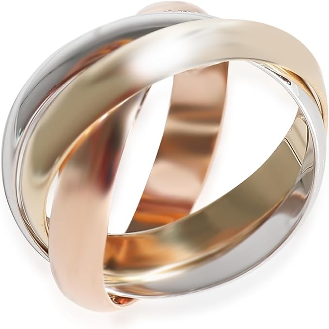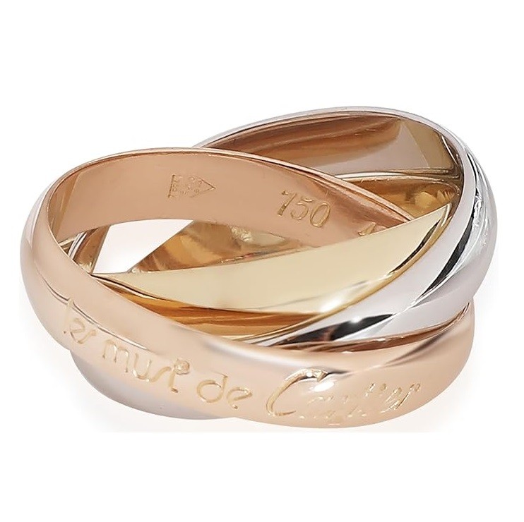 Louis Cartier, the founder's grandson, introduced the Trinity ring in 1924. The ring is characterised by its three-band construction, intertwined to create an eternity effect. The collection has since expanded to include necklaces, bracelets and earrings. Retails for 1340 USD. In excellent condition and recently polished. Ring size is 4.5. Comes with Box.