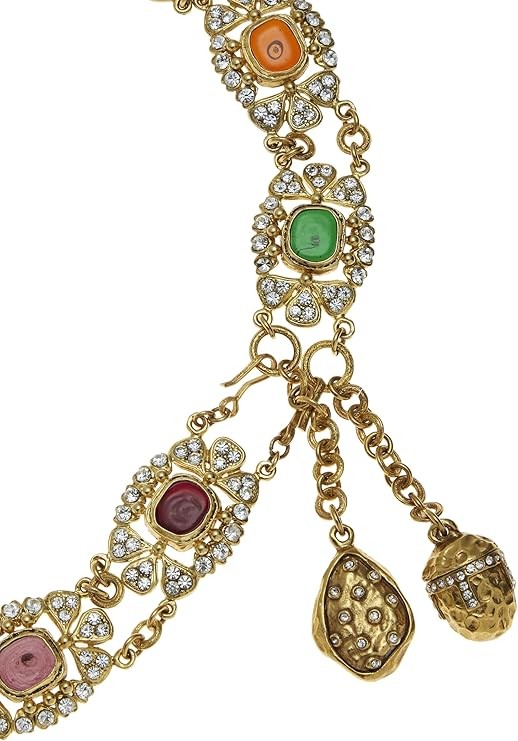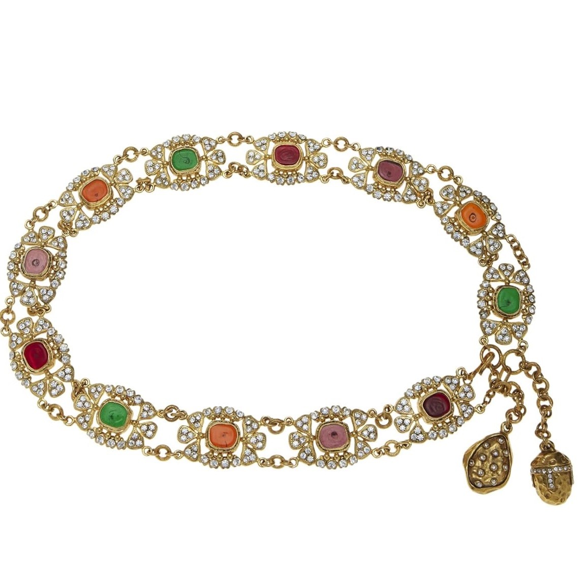 Rare vintage Chanel gold-tone chain belt from 1984, featuring multicolored Gripoix pendants with crystal-embellishment at the borders. Belt closure can be hooked on any chain link for a variety of looks and sizes. About Gripoix Glass: First produced by Parisian glass-maker Augustina Gripoix in the late 1800s, the eponymous jewelry style was created by pouring glass into shapes and colors meant to imitate the look of authentic pearls and crystals. Coco Chanel later made this poured glass iconic by replicating Byzantine-style jewelry using the Gripoix glass. Chanel Gripoix jewelry has since become covetable and collectible to followers of the house, as the original vintage pieces become increasingly harder to find.
