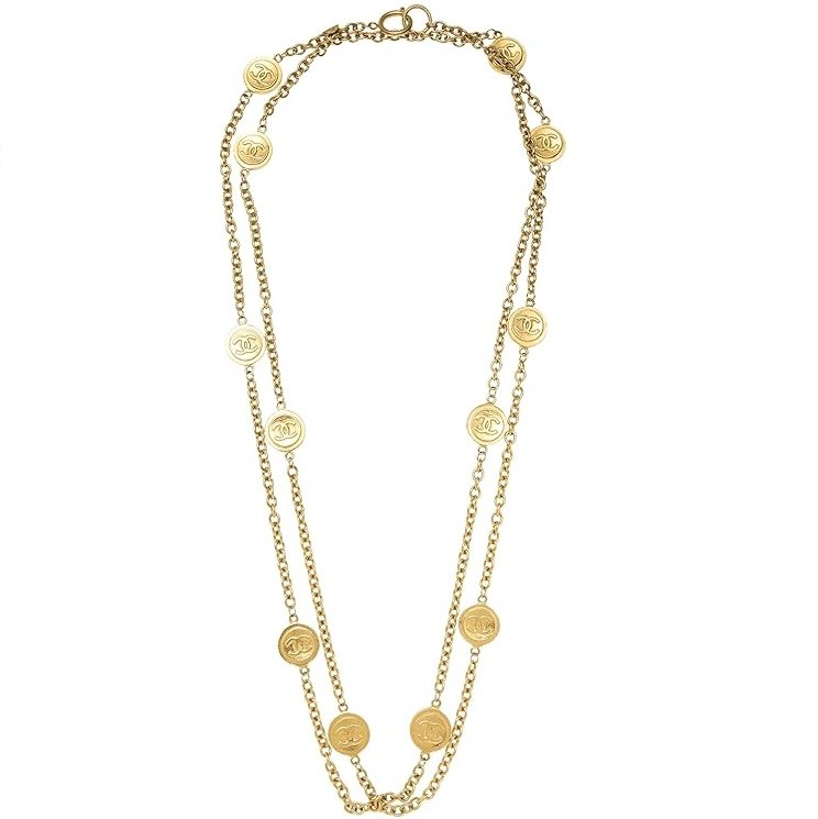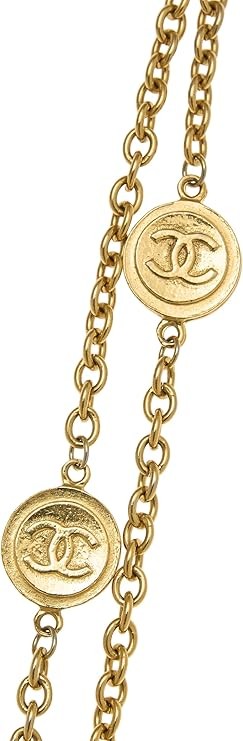 Rare pre-owned vintage gold-tone chain link necklace with 'CC' engraved coin pendants accented throughout. Versatile in wear, layer the necklace or wear long depending on your styling needs.