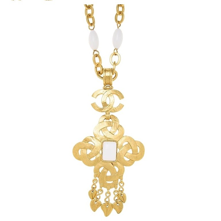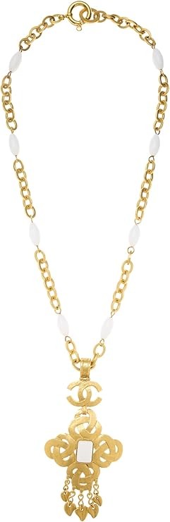 Vintage pre-owned Spring 1995 Chanel gold-plated long chain necklace featuring a pendant with a squiggle border surrounding a white stone accent. Charm height: 4"