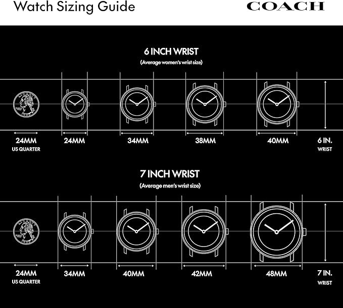 Caring for your timepiece: Your Coach watch has been developed with meticulous attention to quality, function and detail. A maintenance interval of 3 to 5 years is recommended, in addition to any required battery replacement. Never open the watch yourself.