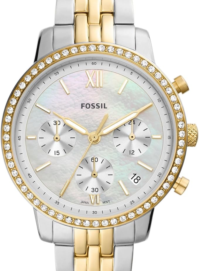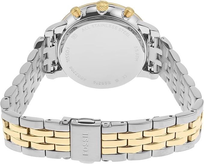 Watch Band: Silver and gold two-tone, durable stainless steel bracelet band with a secure fold-over clasp closure; links can be removed for a customized fit; interchangeable with all Fossil 16mm straps.