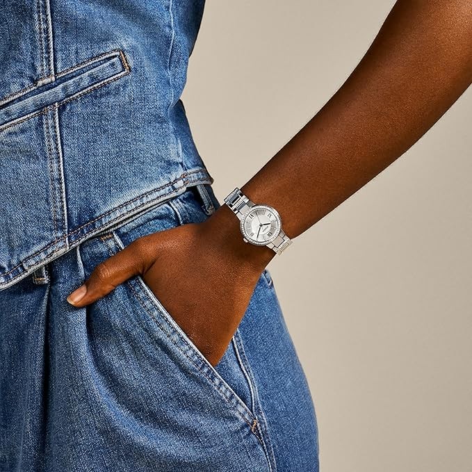 Dial: Round silver stainless steel case, with a silver dial and glitz accents.