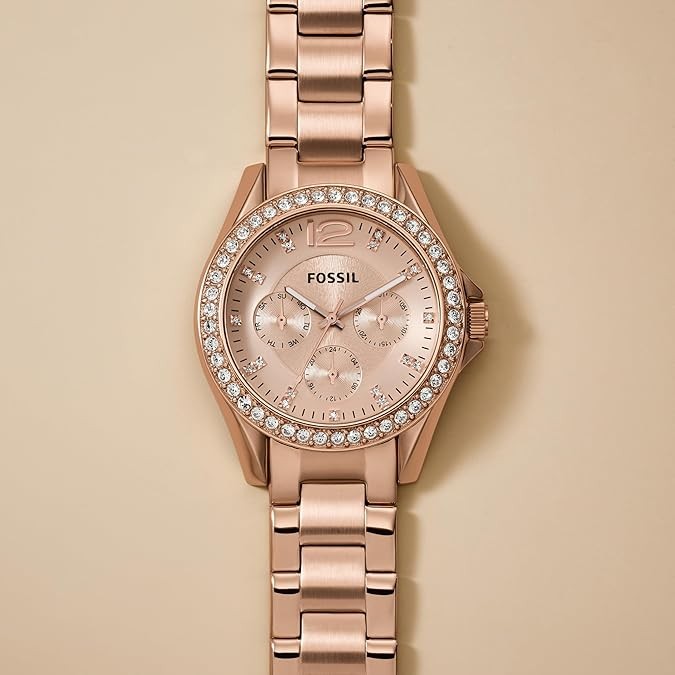 Our signature Riley style with a 45-stone topring, features a rose gold-tone finish and a textured rose dial. This Riley watch also features a multifunction movement.