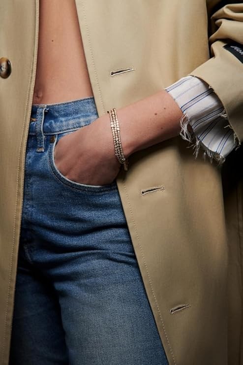 Fully articulated bezel-set yellow gold tennis bracelet with graduated size pattern of round and heart cut diamonds.