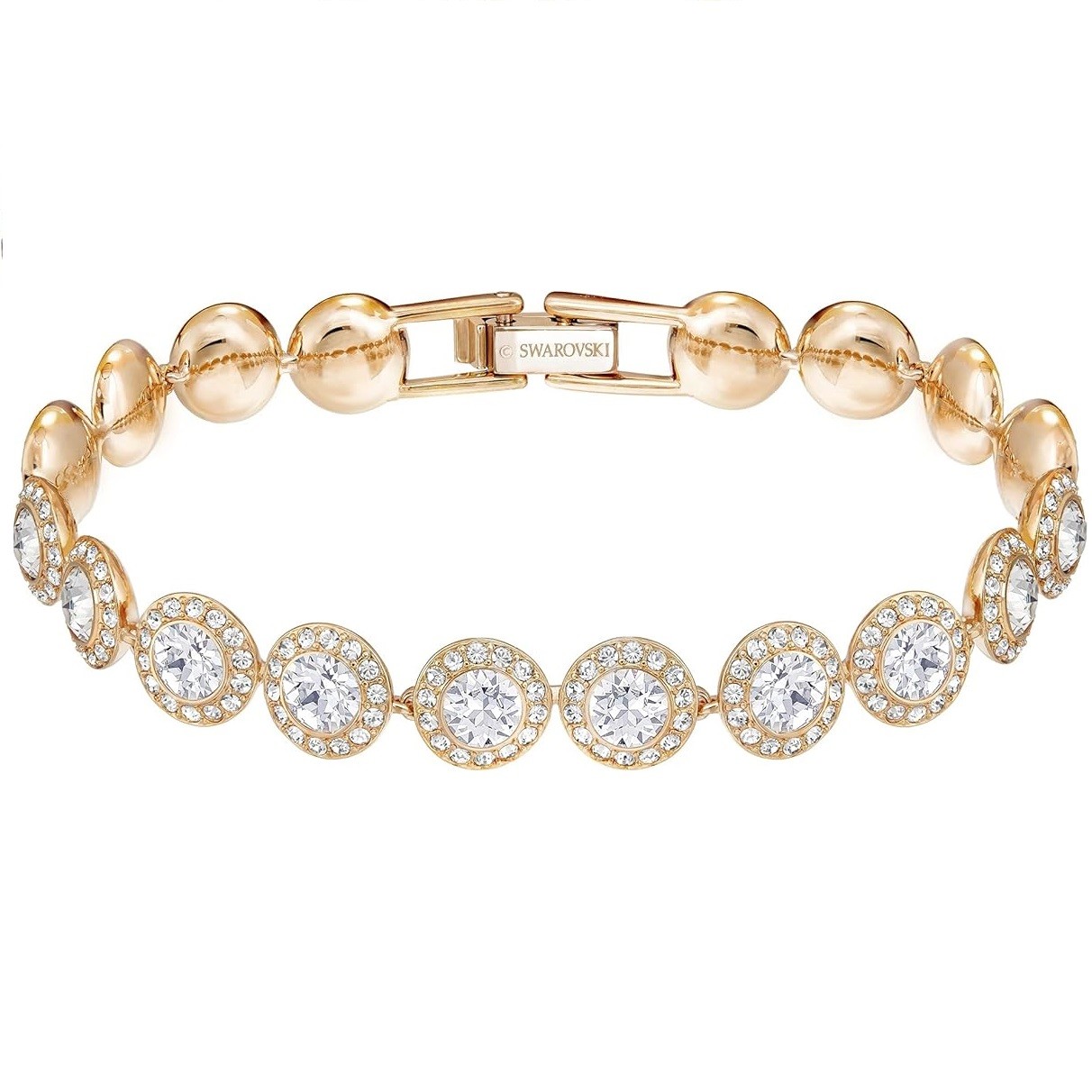 Items delivered: (1) Swarovski Una Angelic soft bracelet for women with white circle-cut crystals and matching crystal pavé on a rose-gold tone finish plated setting, complete with Swarovski bracelet box